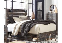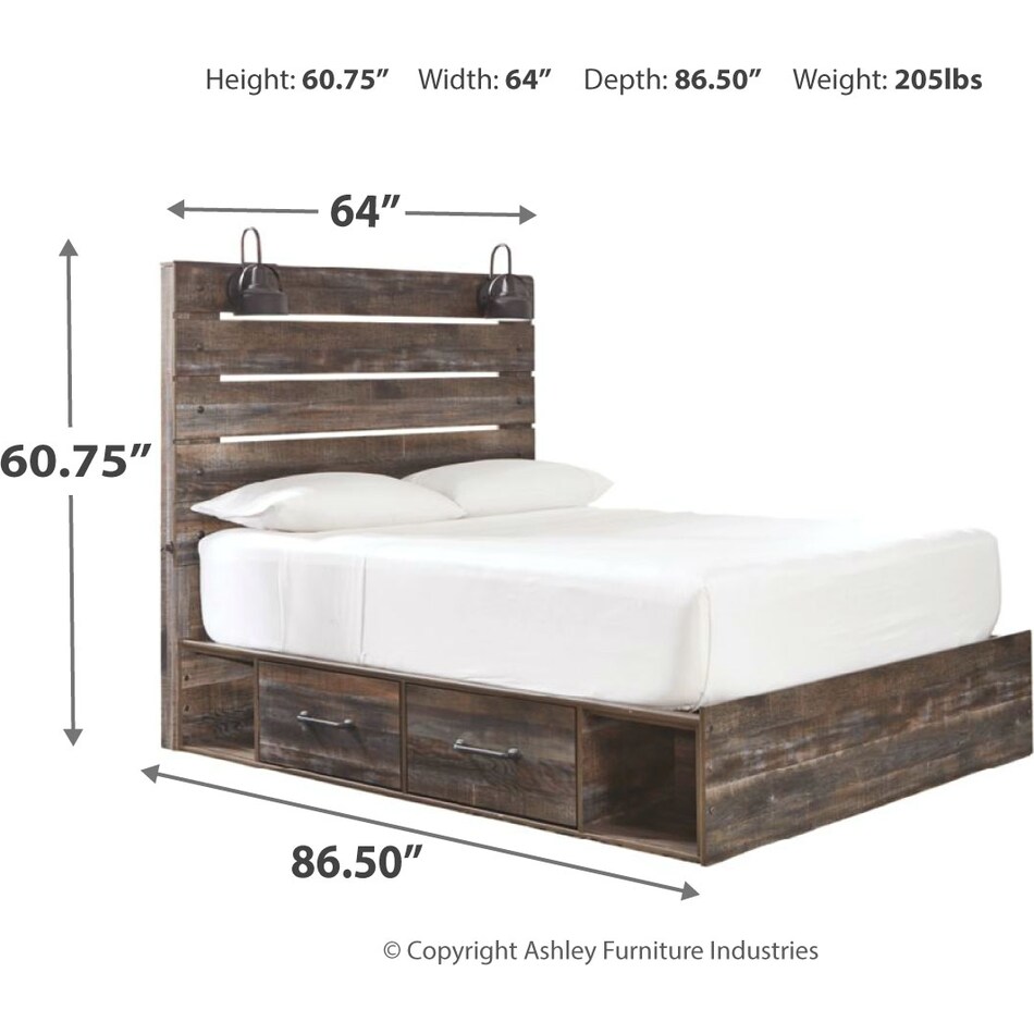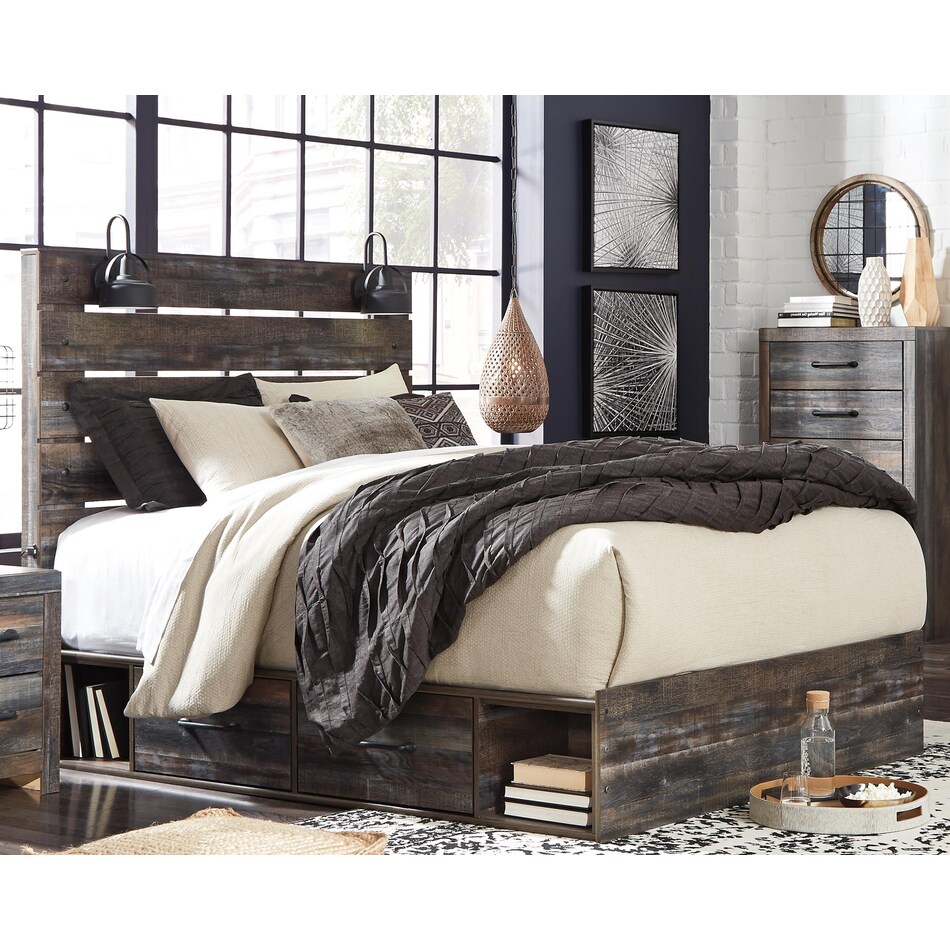 Drystan Queen Storage Bed – Rustic Industrial Style with Smart Storage When rustic warmth meets industrial edge, the Drystan Queen Storage Bed creates the perfect blend. This barn board-inspired design features detailed wood grain with hints of burnt orange and teal tones, delivering authentic weatherworn charm. The open-slat headboard includes a pair of retro-chic light sconces and USB plug-ins—perfect for reading or charging devices. Beneath the bed, smooth-gliding drawers and open cubbies provide stylish, practical storage for your essentials. Manufactured by Ashley Furniture, the Drystan Queen Storage Bed is available now at Morris Home Furniture—your destination for quality, stylish furniture.